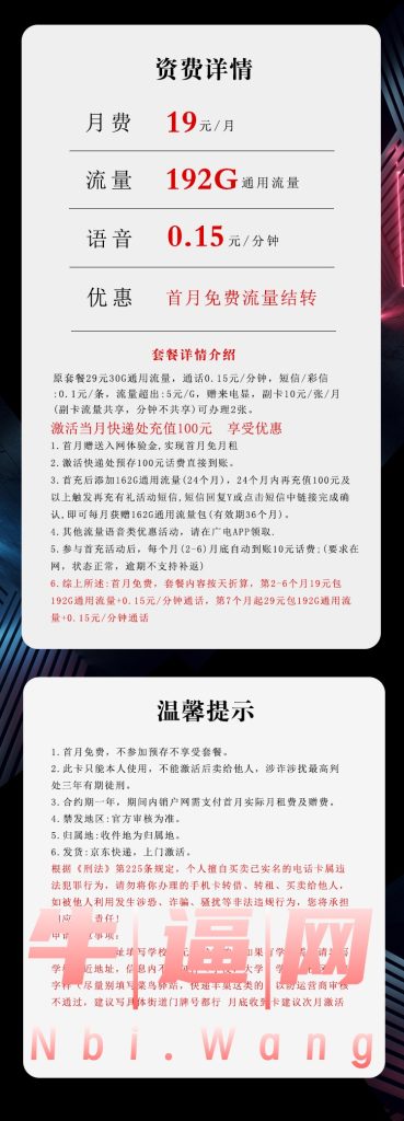 6.综上所述:首月免费,套餐内容按天折算,第2-6个月19元包192G通用流量+0.15元/分钟通话,第7个月起29元包192G通用流量+0.15元/分钟通话